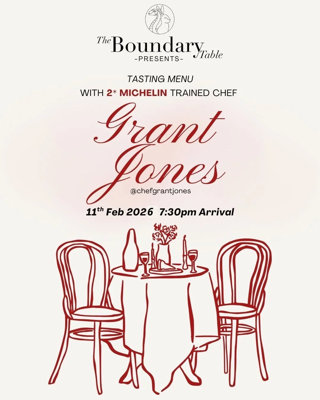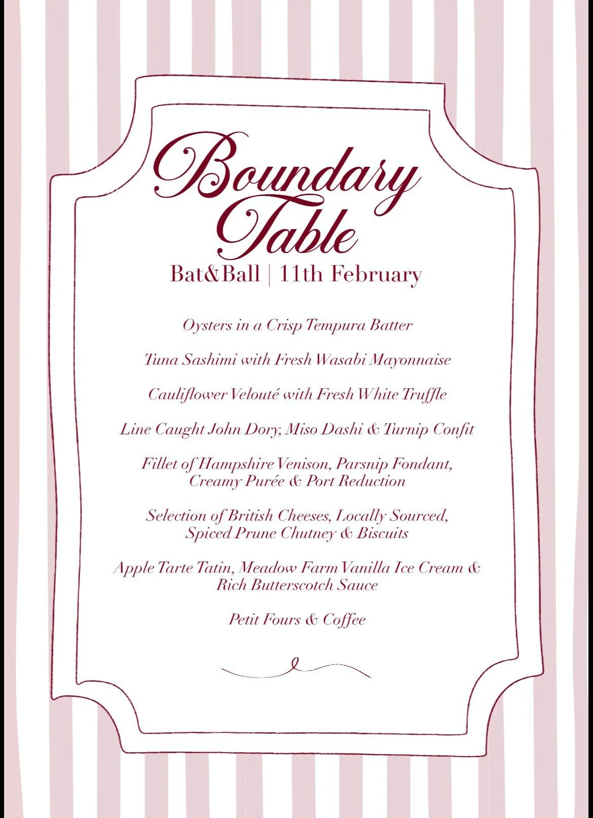 Our next Boundary Table Night will take place on 11th February at 7.30pm and features a fantastic 8 course menu designed by Michelin-star trained chef Grant Jones. Reservations only Bookings@thebatandball.co.uk
